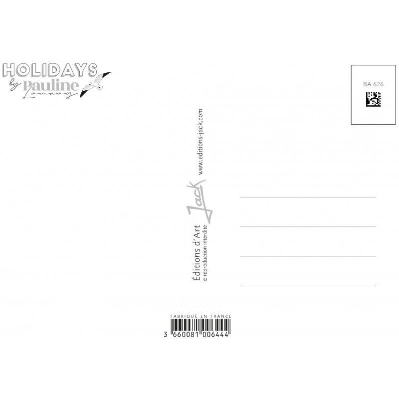 La collection de cartes postales "Holidays" de Pauline Launay vous fera voyager sur nos côtes Françaises, dans un esprit Bord de Mer aux jolies couleurs pastels. Souvenir de vacances, future destination, vous trouverez certainement la carte postale qui vous séduira !